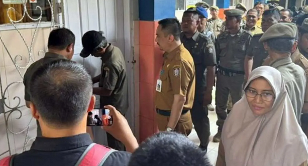 Petugas yang datang bersama Satpol PP kemudian mencabut paksa spanduk yang menutup ruangan kepala sekolah.