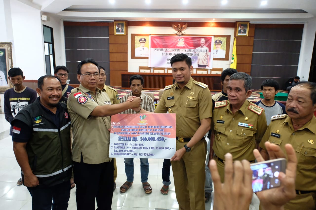 GOWA, LINKSULSEL.COM– Kementerian Sosial (Kemensos) Republik Indonesia melalui Dirjen Perlindungan dan Jaminan Sosial Kemensos RI, Harry Hikmat menyerahkan bantuan kepada korban banjir dan tanah longsor senilai Rp 546.908.450,- kepada Pemerintah Kabupaten Gowa yang dalam hal ini diterima langsung oleh Bupati Gowa, Adnan Purichta Ichsan, di Baruga Karaeng Galesong, Kantor Bupati Gowa, Senin (28/1) sore.