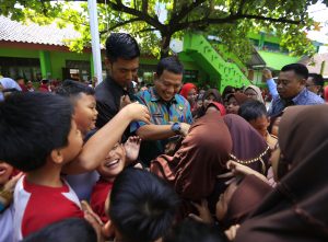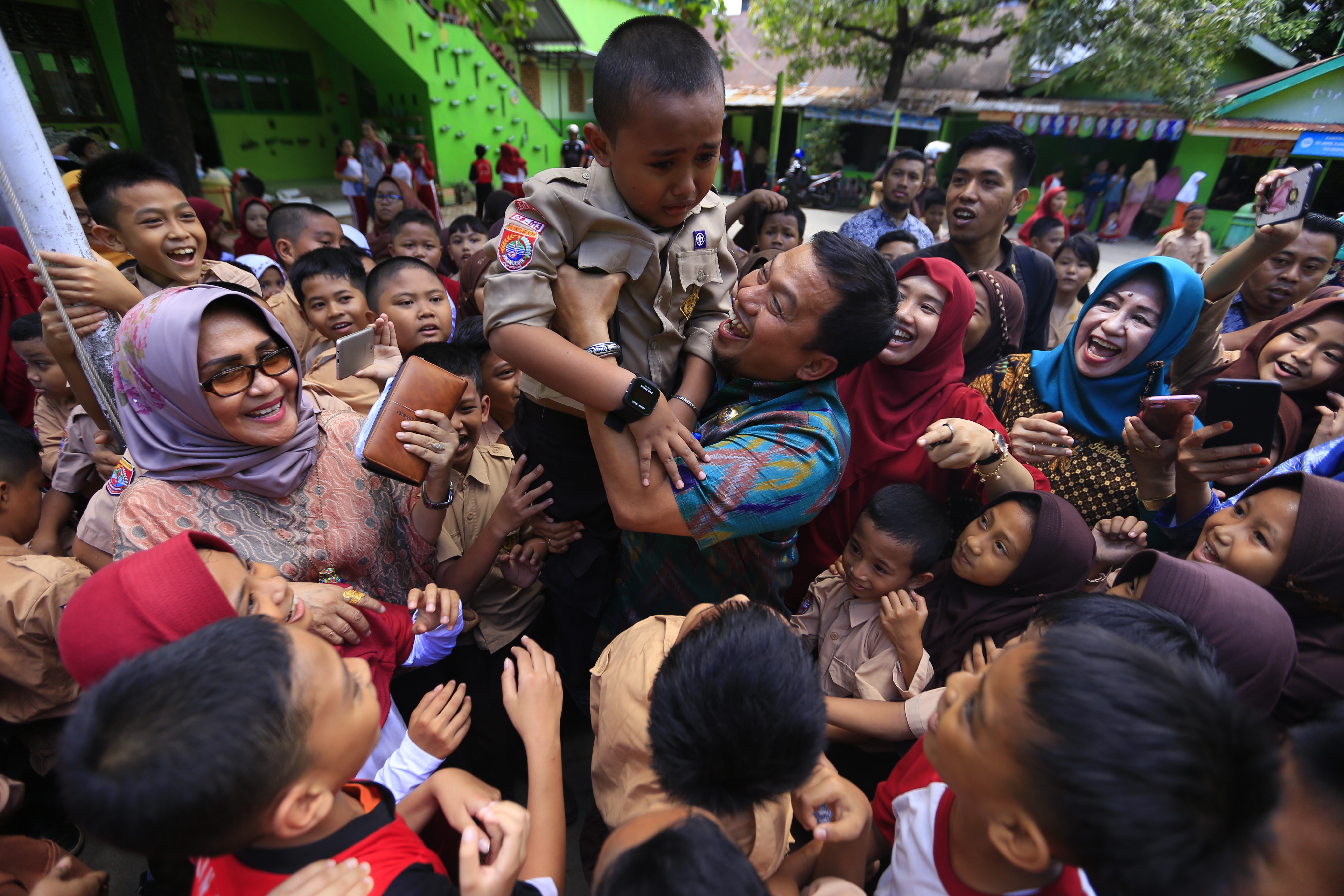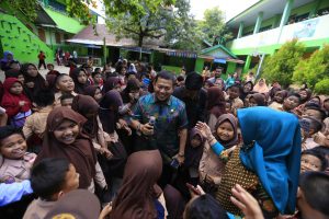Kehadirannya disambut meriah oleh ratusan pelajar SD yang berkerumun langsung menyerbu Iqbal.