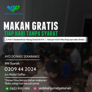 “Makan Gratis Tiap Hari ini berlangsung pada 1 April 2019. Siapa saja boleh singgah makan, bukan cuma fakir miskin. Setiap hari disediakan 200 porsi dalam bentuk prasmanan. Ini terlintas begitu saja, karena kan yang pekanan sudah sering. Kita berpikir, kenapa enggak sekalian kita buat yang harian,” jelasnya.