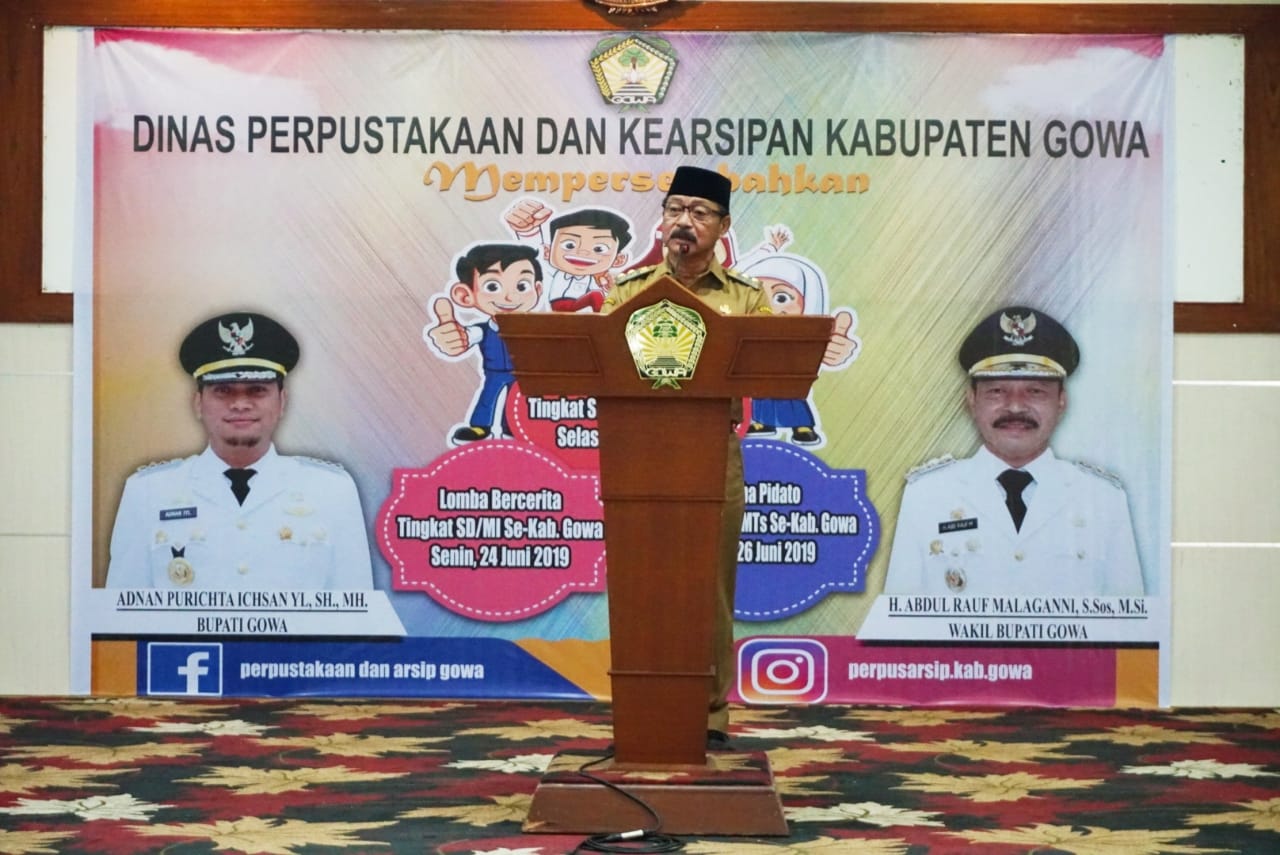 GOWA, LINKSULSEL.COM- Pemerintah Kabupaten Gowa melalui Dinas Perpustakaan dan Kearsipan kembali menggelar lomba baca estafet, bercerita tingkat SD/MI, dan lomba pidato tingkat SMP/Mts, di Baruga Karaeng Galesong, Senin (24/6).