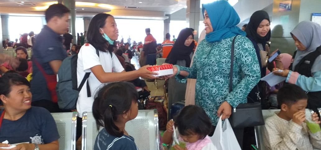 MAKASSAR, LINKSULSELCOM- Perwakilan Tim Penggerak PKK Provinsi Sulawesi Selatan membagikan langsung nasi dos kepada para pengungsi Wamena yang tiba di Pelabuhan Soekarno Hatta, Sabtu (5/10).