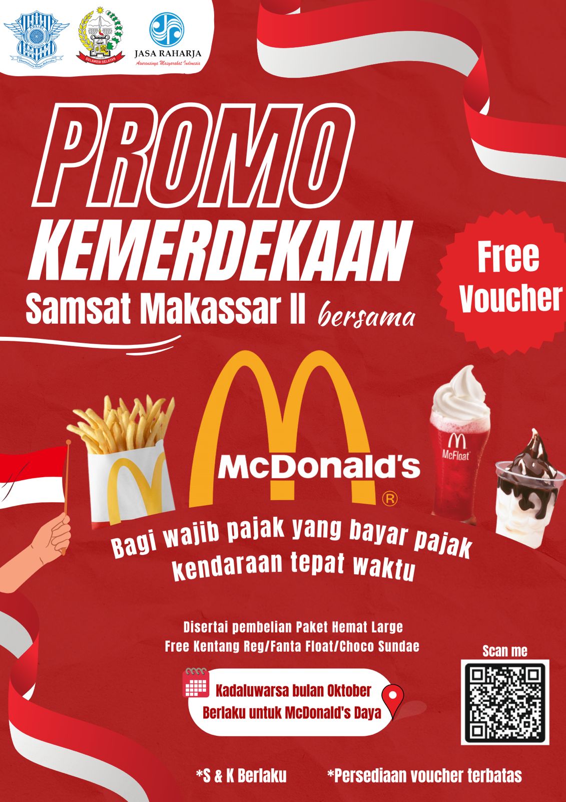 “Wajib pajak yang membayar pajak kendaraan tepat waktu akan mendapatkan voucher untuk mendapatkan tambahan makanan dan minuman tersebut di McD Daya. Penawaran ini sekaligus dalam rangka hari kemerdekaan ke 78 Republik Indonesia program ini berlaku dari bulan Agustus sampai dengan oktober 2023 atau selama persediaan voucher masih ada,” ujarnya.