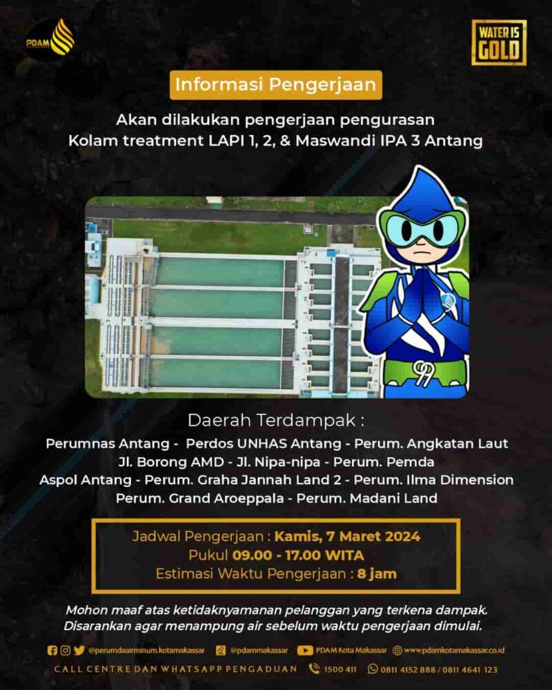 MAKASSAR,- LINKSULSEL -Pihak Perumda Air Minum Kota Makassar akan melakukan pengerjaan pengurasan kolam treatment LAPI 1, 2 dan Maswandi IPA 3 Antang.