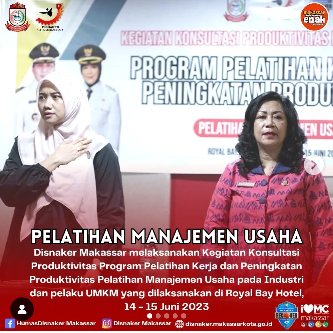 Pelatihan Manajemen Usaha, Pelatihan ini, kata Nielma Palamba selaku Kadisnaker Makassar, merupakan upaya Pemerintah Kota Makassar dalam rangka meningkatkan produktivitas tenaga kerja pada para pelaku usaha di sektor industri, yang diharapkan melalui pelatihan ini para peserta mampu memahami teknik untuk meningkatkan produktivitas usaha masing-masing sehingga akan memperkuat daya saing yang berimbas pada peningkatan penyerapan tenaga kerja dan penurunan angka pengangguran.