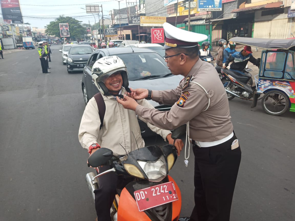 Nampak jelas, petugas pun memberhentikan langsung sejumlah pengendara yang tidak menggunakan helm sesuai ketentuan, guna diberikan sosialisasi.