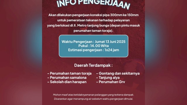 Plt Kepala Bagian Distribusi dan Kehilangan Air (DKA) PDAM Kota Makassar, Rommy mengimbau kepada warga di wilayah terdampak untuk melakukan penampungan air secukupnya sebelum pekerjaan dimulai, guna mengantisipasi kebutuhan air selama proses berlangsung.