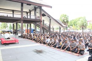 Tampak suasana begitu hikmat tatkala seluruh personil pun menundukkan kepala seraya mendengar lantunan doa yang diucapkan untuk mengantar para personil yang akan melaksanakan tugasnya mengamankan jalannya Pemilu 2019.