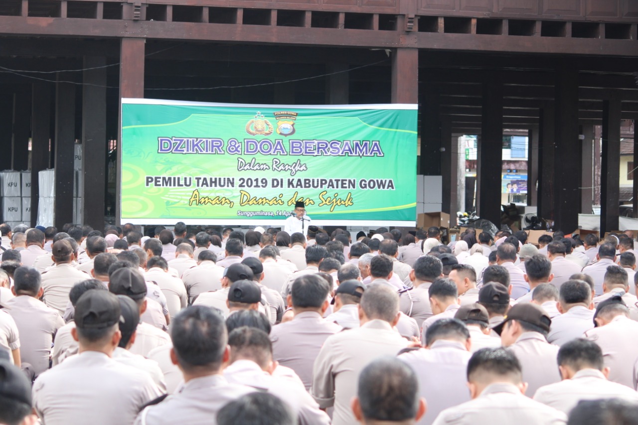 Doa bersama yang dipimpin langsung oleh Ketua MUI Gowa KH. Abubakar Paka, yang turut dihadiri Dirbinmas Polda Sulsel Kombes Pol Markilat selaku Pamatwil, dan diikuti oleh Kapolres Gowa Akbp Shinto Silitonga, para PJU, para Kapolsek dataran rendah, serta ratusan personil gabungan Polres Gowa dan BKO dari Polda Sulsel yang akan melaksanakan pengamanan TPS.