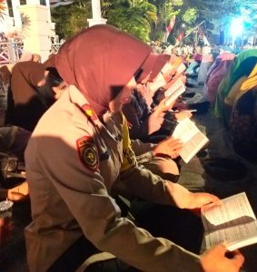 Nampak jelas, personil Polwan yang mengenakan seragam dinas ini pun berbaur di tengah para hadirin, dan mengikuti tahlilan dengan penuh khidmat.