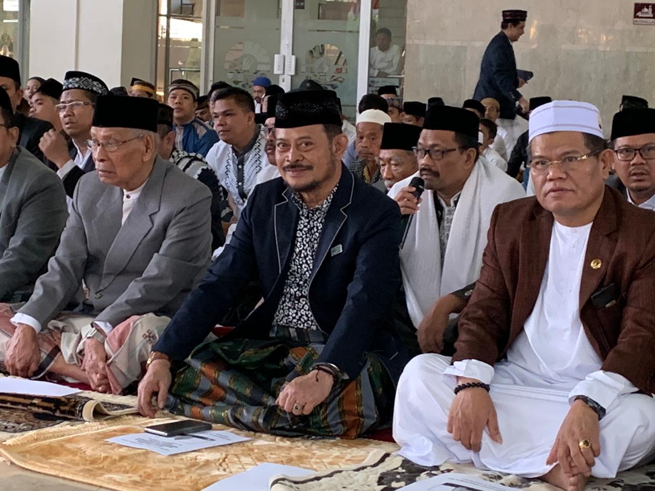 MAKASSAR, LINKSULSEL.COM– Mantan gubernur Sulsel, Syahrul Yasin Limpo (SYL) menunaikan Salat Iduladha 10 Duzhijjah 1440 H di Pelataran Gedung Phinisi UNM Makassar, Ahad (11/8/2019).