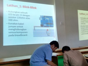 Di hari pertama, Ir Rahimuddin ST., MT., PhD selaku ketua tim pelaksana Unhas menyampaikan materi dasar pemprograman Arduino dan mikrokontroller, penerapannya dalam berbagai peralatan penting, serta penerapannya dalam revolusi industri 4.0. Dibantu oleh tiga mahasiswa, pelatihan dilakukan dengan konsep teori dan praktek langsung pada robot kendaraan penggerak roda dua dan empat dengan membagi peserta dalam lima kelompok.
